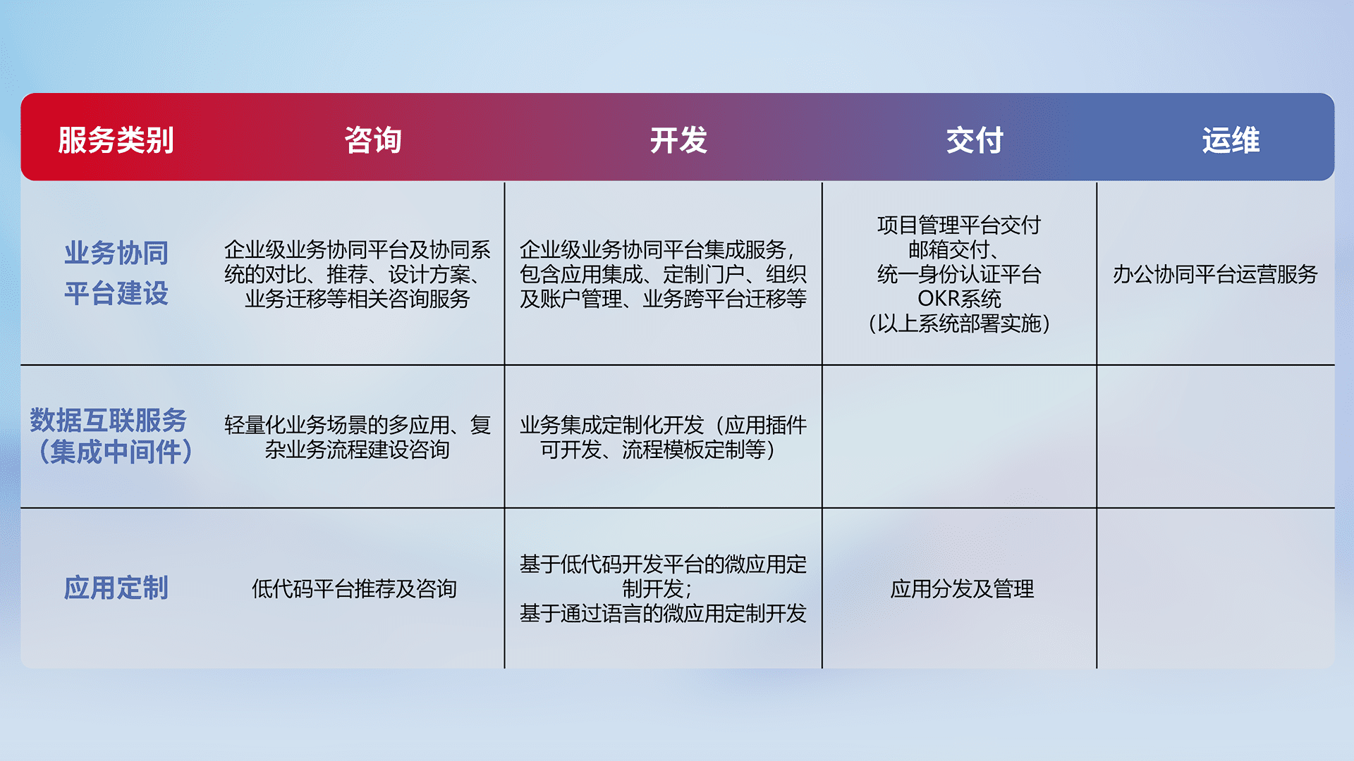 针对钉钉、、企微、、IDaas等平台级产品提供产品的规划、、、方案、、、、交付、、、定制化开发等服务,,实现如统一协同办公、、智能客户服务、、、混合会议管理、、智能数据查询、、等业务场景,,实现数字化转型。。